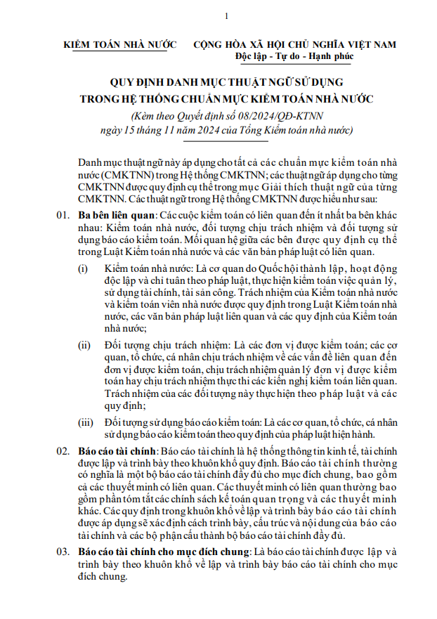 Ngày 15/11/2024, Tổng Kiểm toán nhà nước Ngô Văn Tuấn ký Quyết định số 08/2024/QĐ-KTNN ban hành Hệ thống chuẩn mực kiểm toán nhà nước. Hệ thống chuẩn mực kiểm toán nhà nước ban hành kèm theo Quyết định này gồm danh mục thuật ngữ và 43 chuẩn mực.